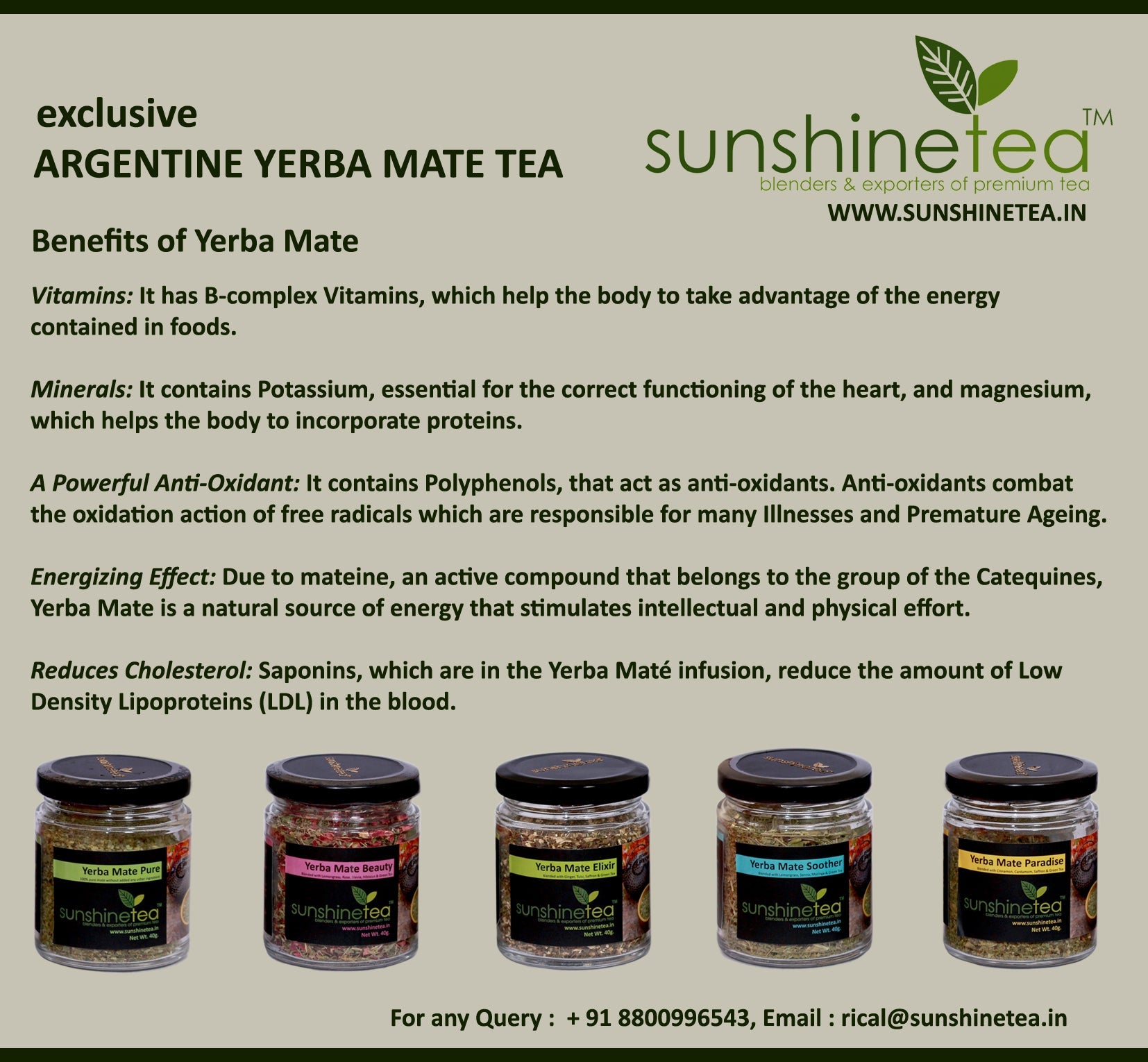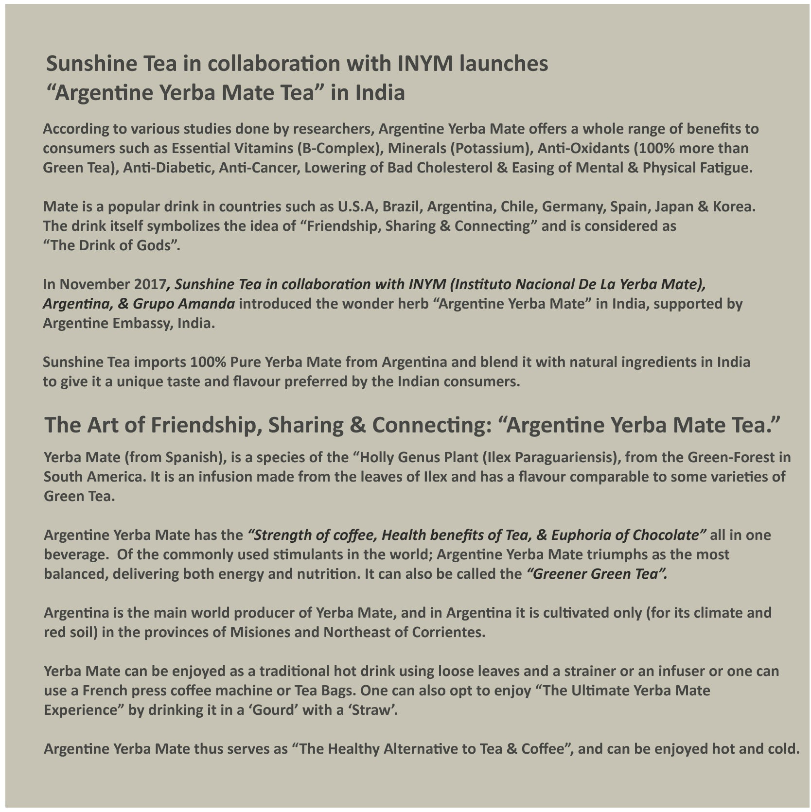 Description: - Yerba Mate popularly known as “Mate” is an infusion tea made from the leaves of the tree called “Ilex”. "Argentine Yerba Mate”, a greener version of green tea, has ‘The Strength of the Coffee, Health Benefits of Tea & Euphoria of Chocolate. According to various studies done by researchers, Argentine Yerba Mate offers a whole range of benefits to consumers such as Essential Vitamins (B-Complex), Minerals (Potassium), Anti-Oxidants (100% more than Green Tea), Anti-Diabetic , Anti Cancer, Lowering of Bad Cholesterol Level & Easing of Mental & Physical fatigue.
